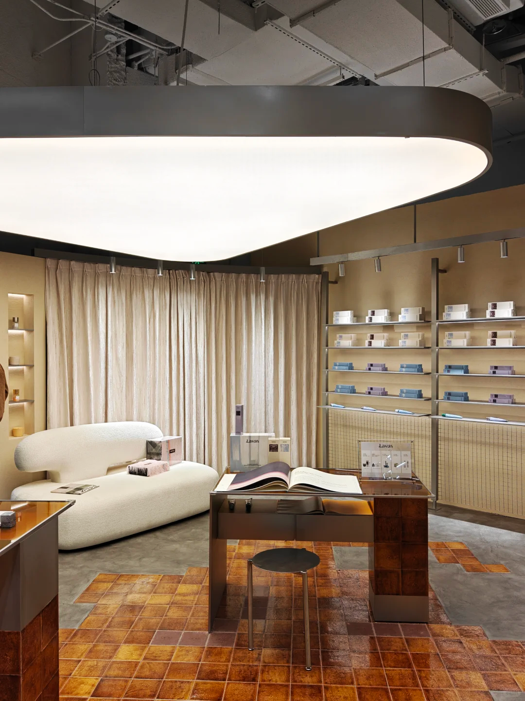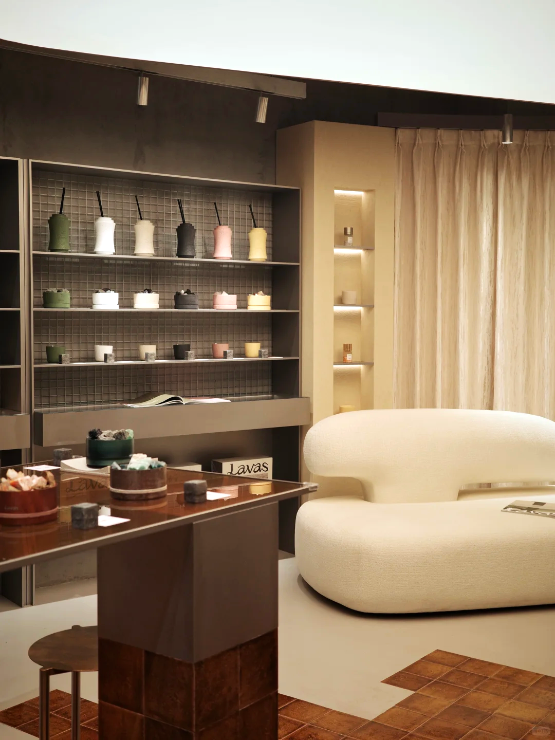 Fragrance brand Lavas has opened a new boutique at UniWalk Qianhai in Shenzhen. At the centre of the space sits a two-seater Pine-Pine Sofa in cedar from Jianze.