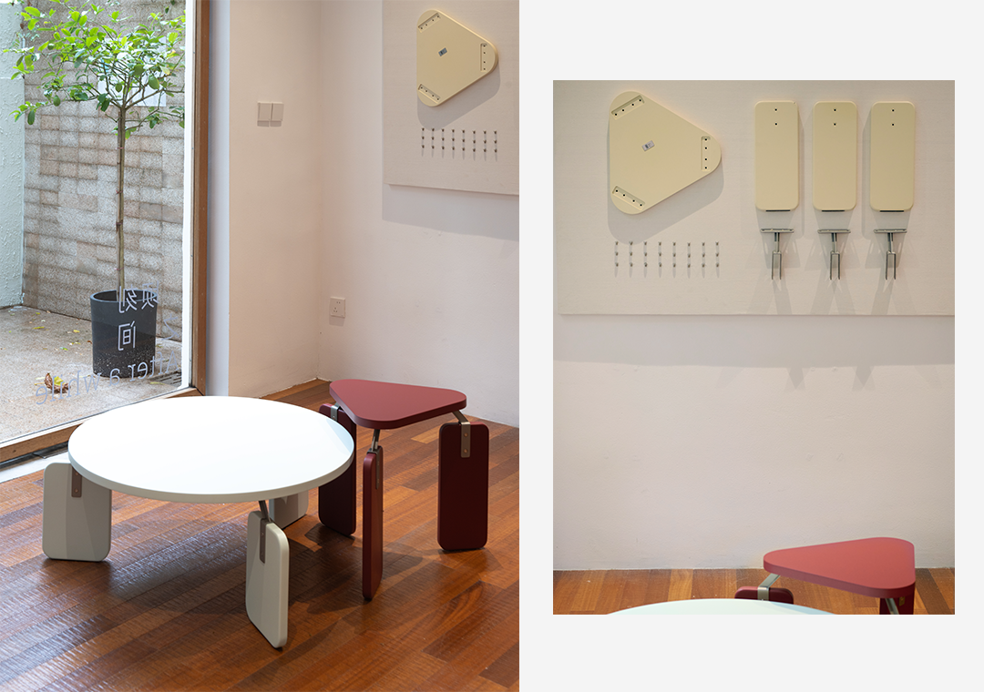 The Joint series, created by studiososlow for Jianze, makes its offline debut. Basic geometric modules like circles, triangles, and rectangles are combined into a stable furniture system, guided by custom-produced metal connectors. On the walls, all components are disassembled into their smallest units and sorted, becoming three-dimensional decorative art that also echoes the inspiration of exploded-view diagrams.