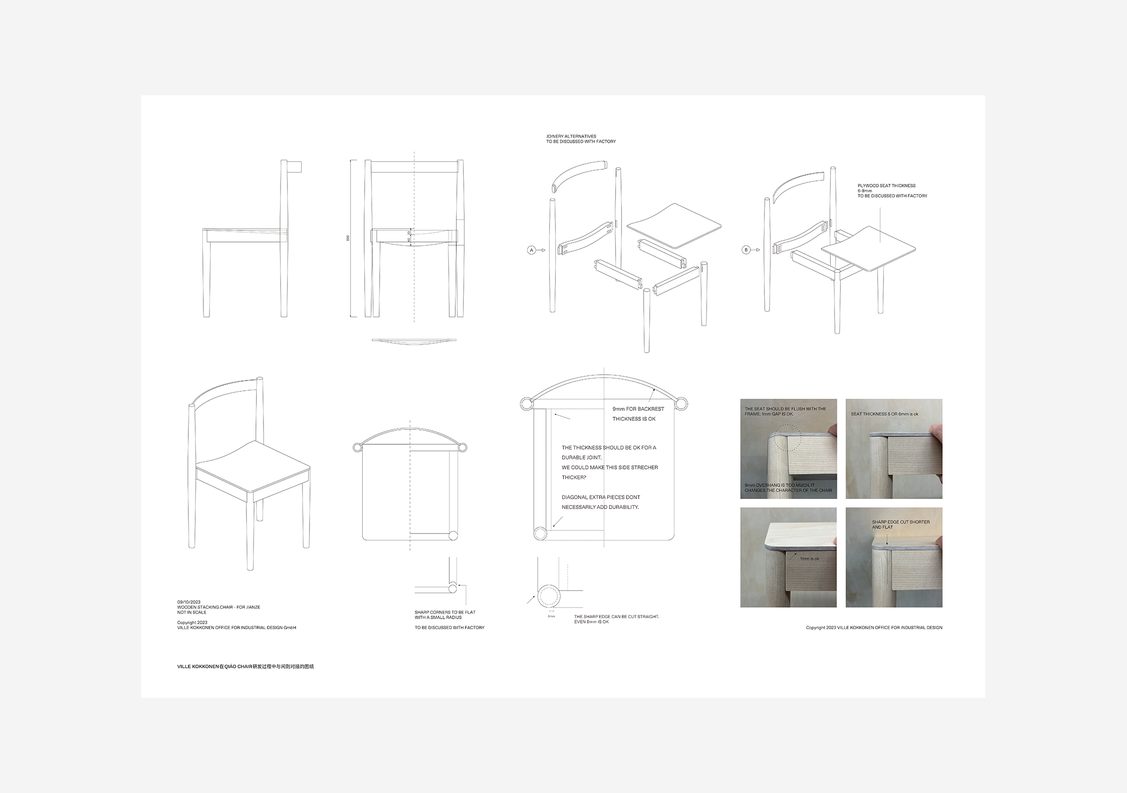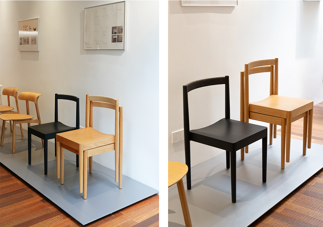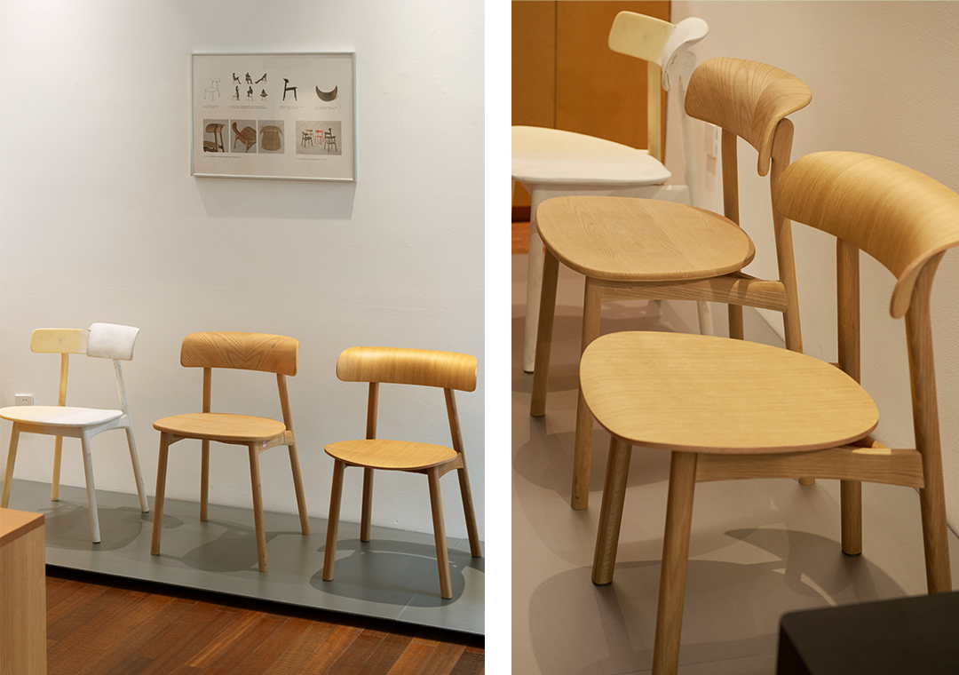 The Yǎng Chair displays three prototypes from its 18-month development process, showcasing the trajectory of a chair gradually taking form through continuous refinement of details. The wood grain, seat surface, beam, and joints have all undergone significant changes, while the lightweight backrest was ultimately realized using German 3D veneer technology, supporting the user to sit more easily and comfortably.