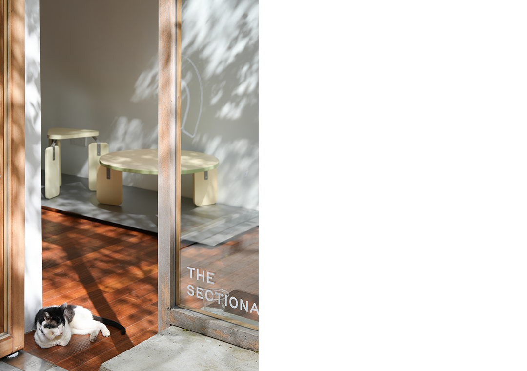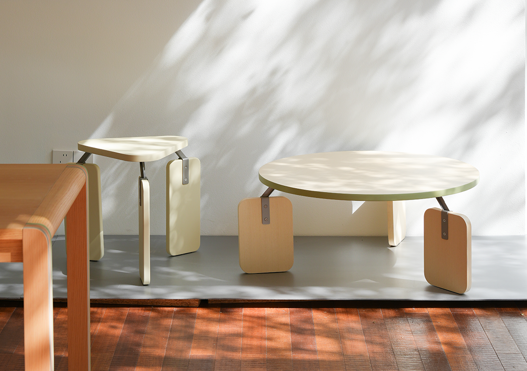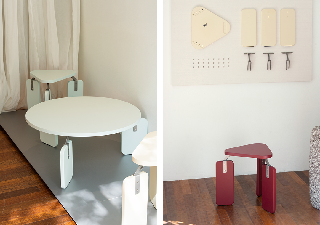 The Joint table featured in this exhibition draws its design concept from the suspended feel of exploded-view diagrams of industrial components. Using exclusively customized metal fittings, it combines colored panels in triangular, circular, and rectangular shapes to construct a unique support system, breaking away from the monotony of traditional coffee and side table forms.