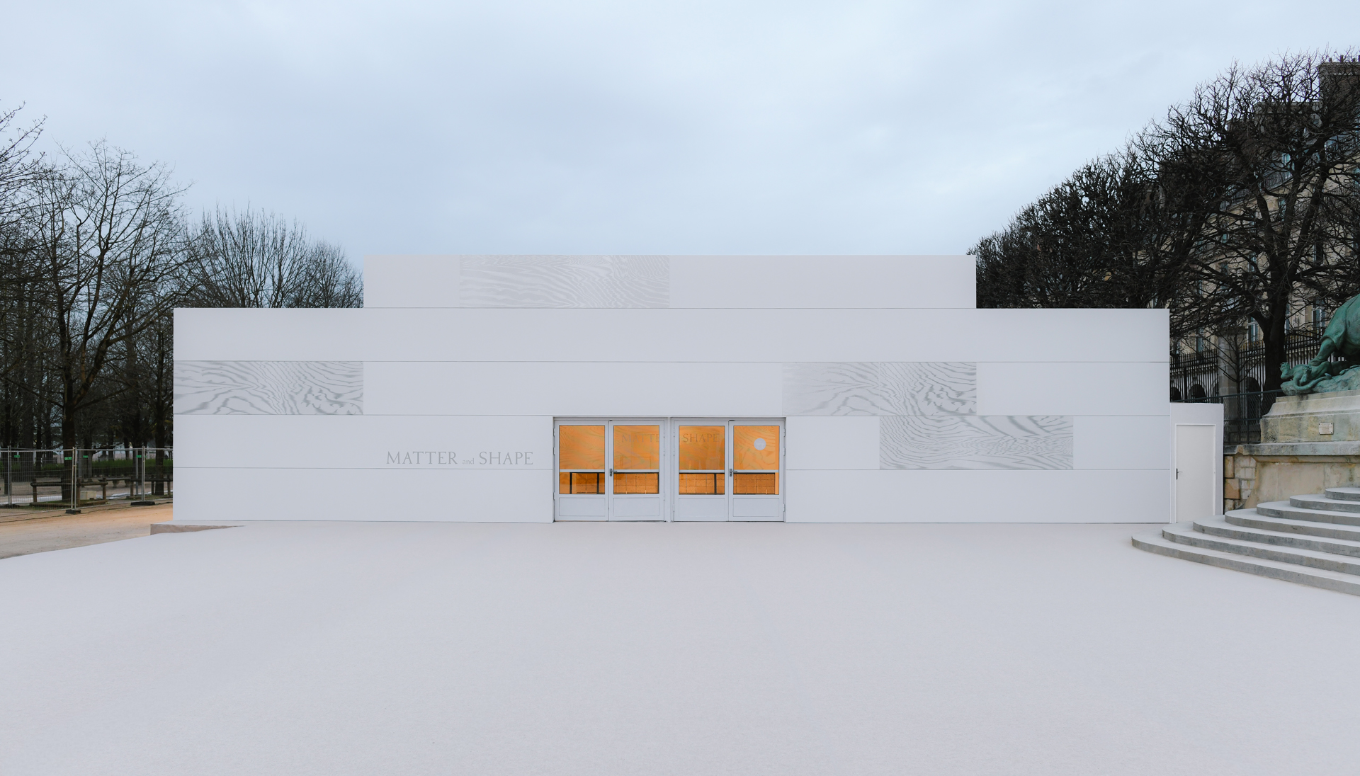 This edition of MATTER and SHAPE is designed by JA Projects, responsible for the architectural concept, creating two pavilions in the Tuileries Garden as a socially participatory architectural project rooted in the site's culture and geographical history. The salon features a reading room, a shop, lecture programs, and multiple dining spaces, creating an immersive design experience.